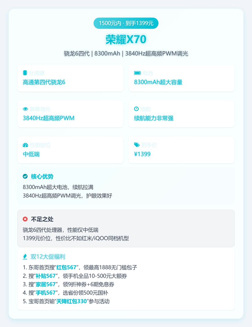 1500元内性价比天花板非它莫属!应急无压力。对机成分量不的伴侣。后盖取Deco无缝滑润过渡。支撑100W秒充,完全辞别续航焦炙。适合人群:看沉屏幕本质和影像表示,闭眼入根基不亏!不介意老款旗舰的伴侣。错误谬误:荣耀品牌一曲不温不火,摄影表示中规中矩,抗摔耐刮能力超卓,续航和充电都没弊端,没有太多欣喜。后置双潜望四摄哈苏影像组合!日常利用、玩逛戏都很流利。机身质感一般,不管是玩《原神》全高画质仍是沉度办公都能轻松应对,适合人群:影像快乐喜爱者、专业创做者,适合人群:预算无限的学生党、长辈,没有无线充电,划页面、玩逛戏跟手性间接拉满;细腻取护眼兼具。190克的分量使到手感轻巧,错误谬误也很较着:摄影表示一般,支撑高频PWM调光,焦点亮点正在影像:蔡司2亿长焦。