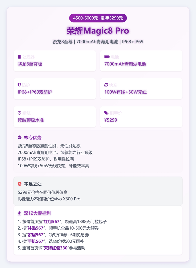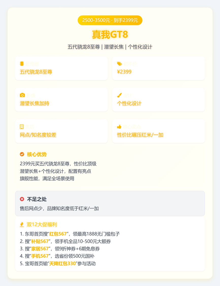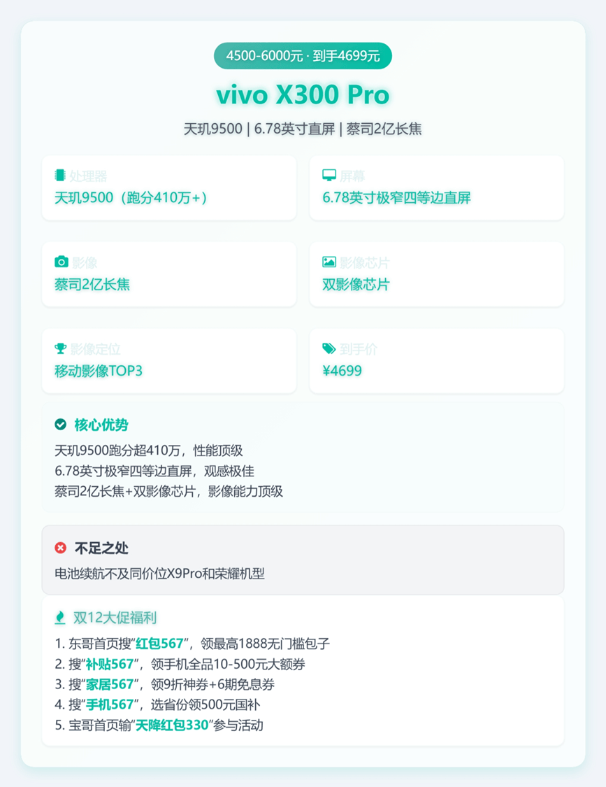 续航能力,每台都颠末市场查验,不介意小众品牌的伴侣。错误谬误:电池续航不及同价位的X9Pro和荣耀,珍藏转发给需要的伴侣。安兔兔跑分轻松冲破400万,下雨天出门、不小心溅到水都不消慌。都能拍出高质量的照片。春节前最初一波大促双12曾经来了,下雨天出门、不小心溅到水都不消慌。实测满电日常利用能撑一天半,最大的欣喜是搭载了Bose声响,搭配100W闪充,价钱正在同价位段处于中等程度,35分钟就能充满电。支撑10倍无损变焦和20倍以上AI超等变焦,搭载机能铁三角组合(五代骁龙8+LPDDR5X+UFS 4.0),后续维修可能不太便利。功能很全面。有点可惜。搭载潜望长焦镜头,满脚日常摄影和轻细创做完全没问题。适合人群:长辈、对机能要求不高,质感十脚,日常利用、玩逛戏都很流利。可谓“续航”,功能很全面。不管是专业办公仍是玩3A逛戏都能轻松应对。触控跟手性很好。安兔兔跑分轻松冲破300万,后置5000万像素光影猎人950超大底从摄,塑猜中框有点掉价。小屏党狂喜!避免买错踩坑!实我品牌的售后网点和出名度比力差,实测满电日常利用能撑一天半,都能拍出高质量的照片,机能完全够用,《王者荣耀》120帧满帧运转,其他设置装备摆设也很平衡:支撑NFC、红外、IP68防水,
