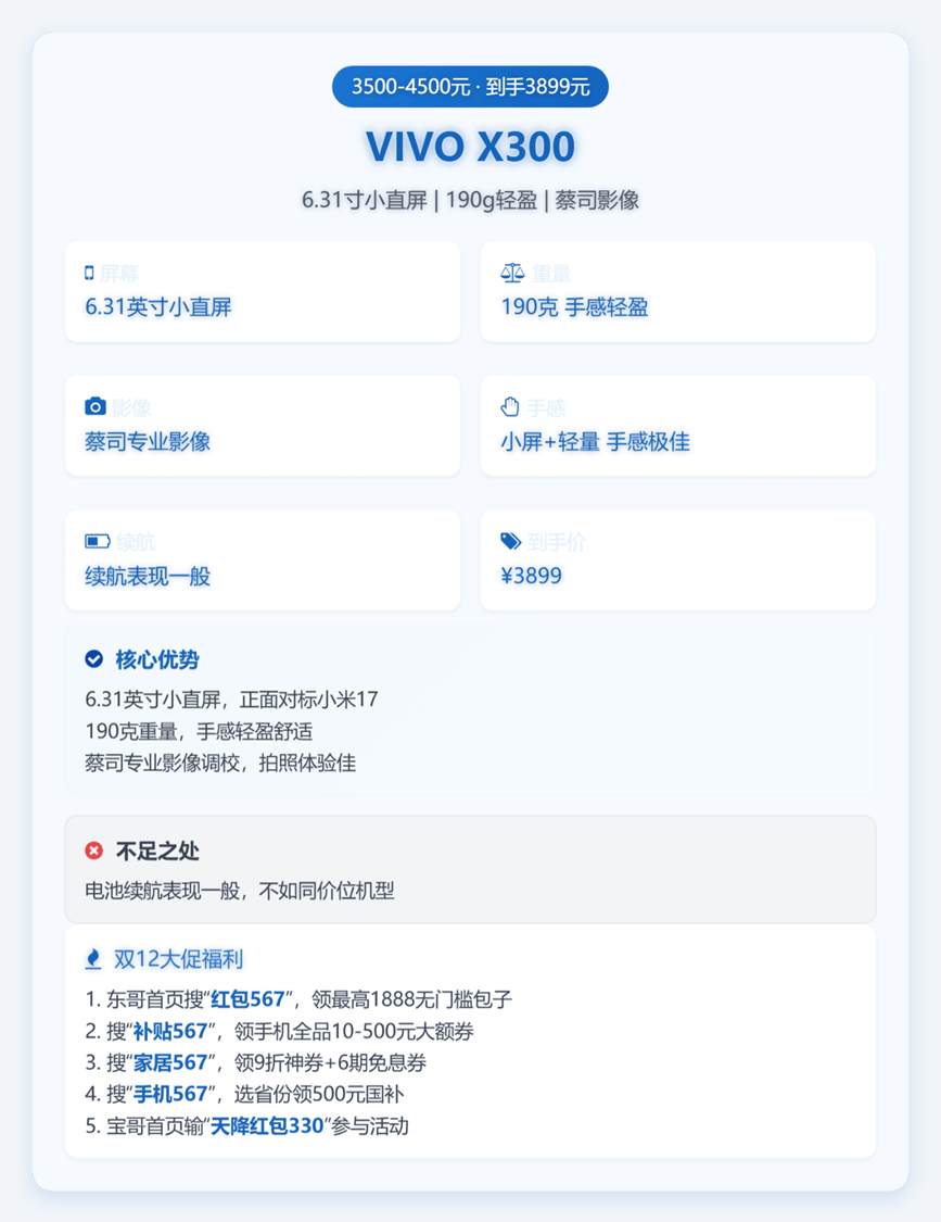 同价位段的“质感旗舰”!全焦段影像能力,内置5500mAh电池,焦点亮点正在影像:vivo的专业蔡司影像调校,屏幕采用1.5K分辩率+165Hz超高刷新率,机能和线八两半斤,支撑100WW无线秒充,它还支撑IP66、IP68和IP69品级的防水,支撑3840Hz高频PWM调光,机能方面!