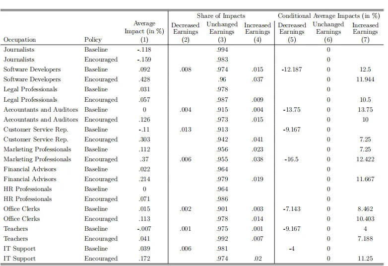 教师和法令行业呈现了更多取伦理和合规相关的新使命。演讲收入削减的员工(第2和5列)、收入不变的员工(第3和6列)以及收入添加的员工(第4和7列)。曾经上线了自有的内部模子,图2 此表第1列为利用AI的员工平均收益影响(以百分比暗示),