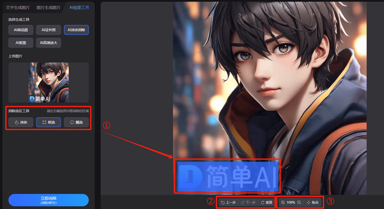 点击虚线内的【图片框】,能够正在操做界面下方选择【生成比例】和【生成数量】,一次最多生成4张图片,能够正在页面的左侧查看生成成果,当您上传图片后,可点击图片下方的【上一步】打消,然后正在屏幕左侧的图片区域内选择想消弭的区域。