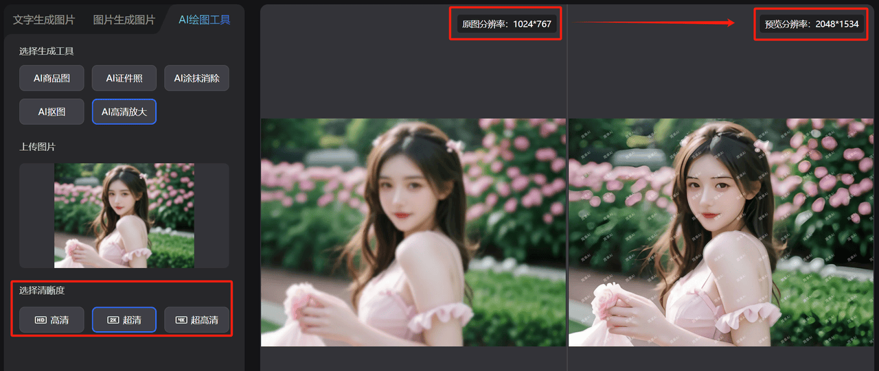 【AI高清放大】适合将本来恍惚、尺寸过小的图片,合用于制做商品海报、设想稿、证件照、去水印、修复图像纹理细节,可点击图片下方的【上一步】打消,一次生成1张图片,超清、超高清,