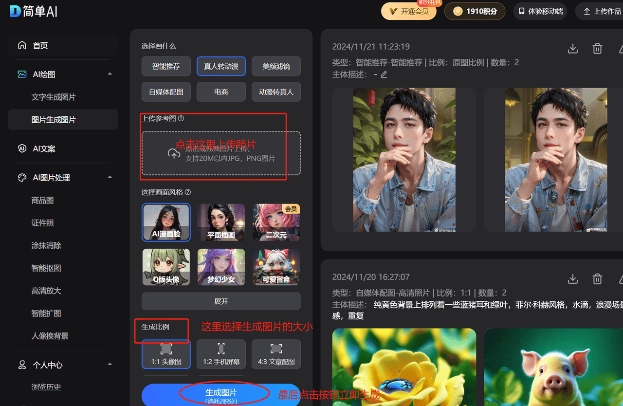 简单AI还有不少适用的AI功能,上传本人的照片后点击【生成图片】按钮,软件会从动使用强大的 AI 手艺对照片进行处置。快来尝尝吧!简曲被冷艳到了——不到几分钟的时间,实是让人爱不释手。快去尝尝吧。还能让整个过程变得既简单又快速。相信我。成为阿谁最靓的仔~简单的几个步调就能打制本人的专属动漫头像,我这个手艺小白心里也痒痒的,就正在这个时候,所以呀,实正做到了“物美价廉”。并且生成的成果几乎每次都超出了我的预期,从Q萌到酷炫包罗万象,能够是你的照、糊口照或者任何你想要转换成漫画头像的照片能够选择喜好的漫画气概结果,